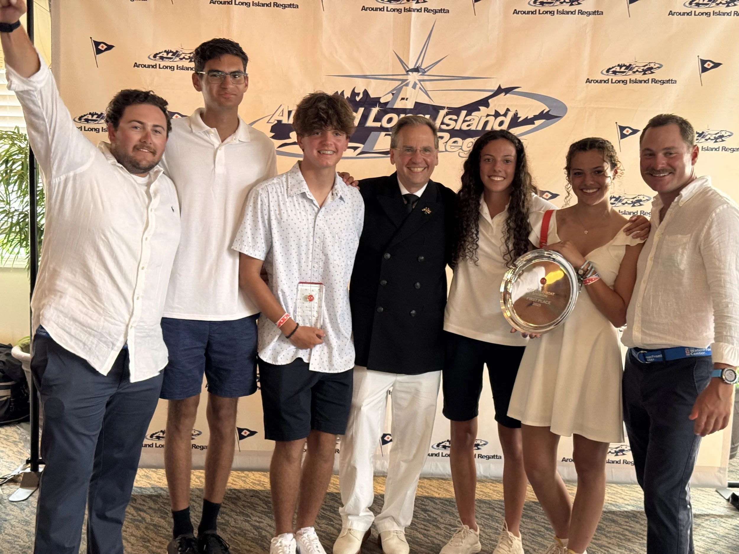 July 28, 2025, Oyster Bay, NY – The WaterFront Center (WFC) is proud to announce that our Junior Big Boat (JBB) team, with an average age of just 19, has made history as the first WFC junior team to compete in a coastal/offshore race at the Around Long Island Regatta (ALIR). Setting sail on July 24, 2025, from New York Harbor, the team conquered the grueling 205-nautical-mile course, averaging 6.2 knots, and celebrated an outstanding 2nd place in their division and 7th place overall at the awards dinner held on July 27, 2025, at Sea Cliff Yacht Club.