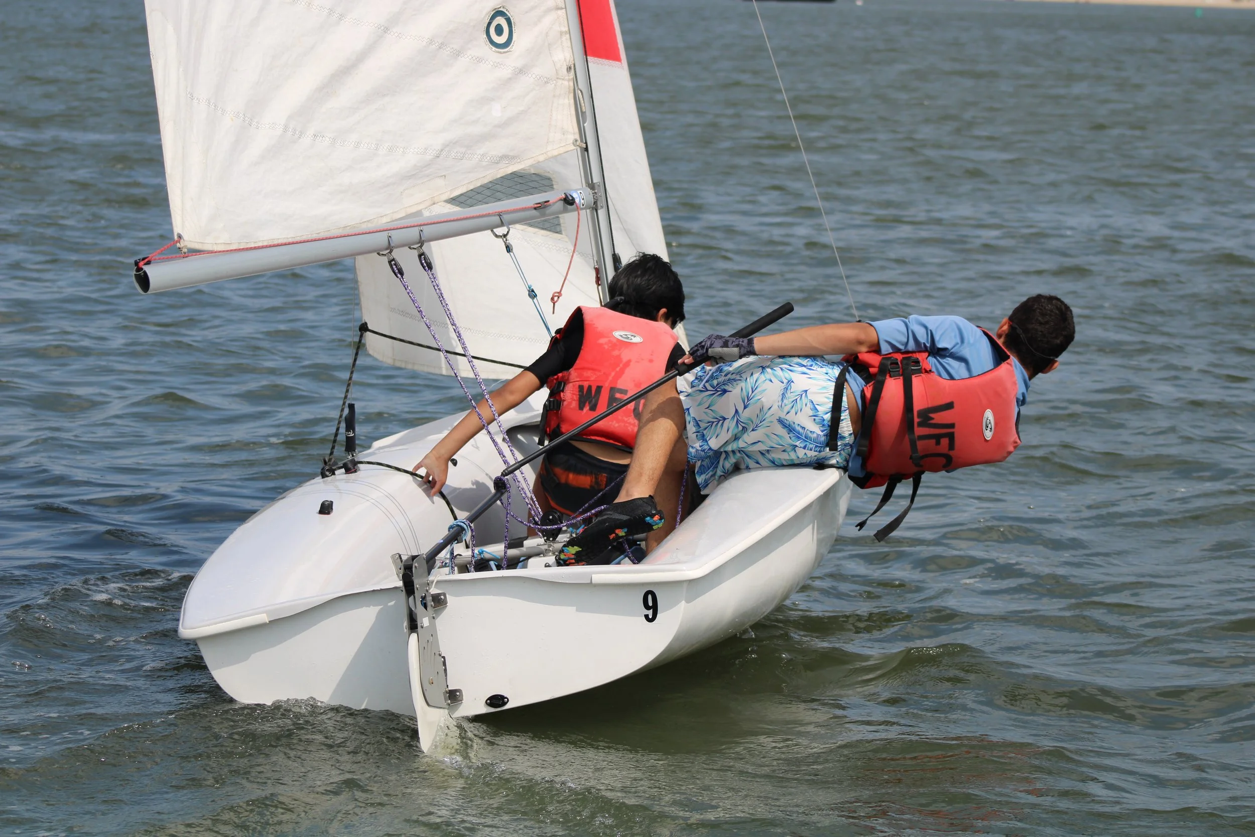 In week two, we started reinforcing our skills through triangle mark rounding and windward-leeward mark rounding drills. We also learned how to properly stay out of irons (the no-go zone). There was a ton of improvement, and along with sailing, we also had lots of fun playing various water games by the beach!