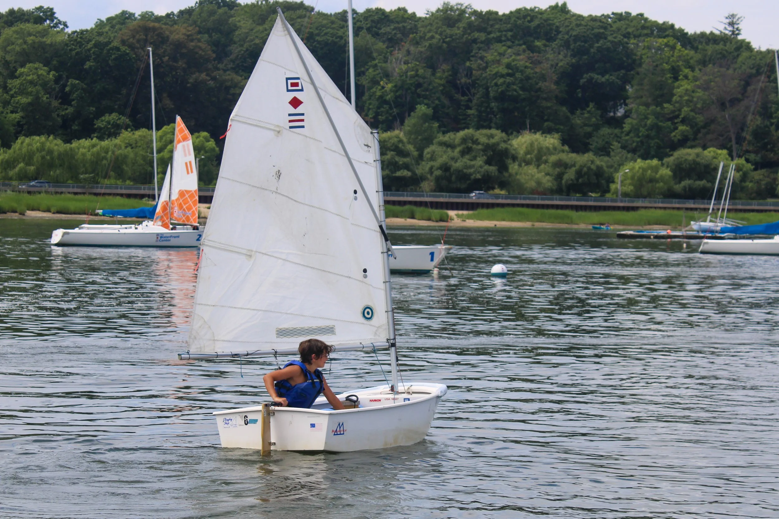 With an experienced group these intermediate sailors got to improve some of their racing skills. They practiced their boat handling by learning how to heal the boat to help steer, as well as roll tacking to improve speed through their tacks. They completed practice starts and races, while learning how to analyze their surrounding. Understanding the wind is the key to sailing and they spent quite a lot of time learning about how the wind affects their sails.